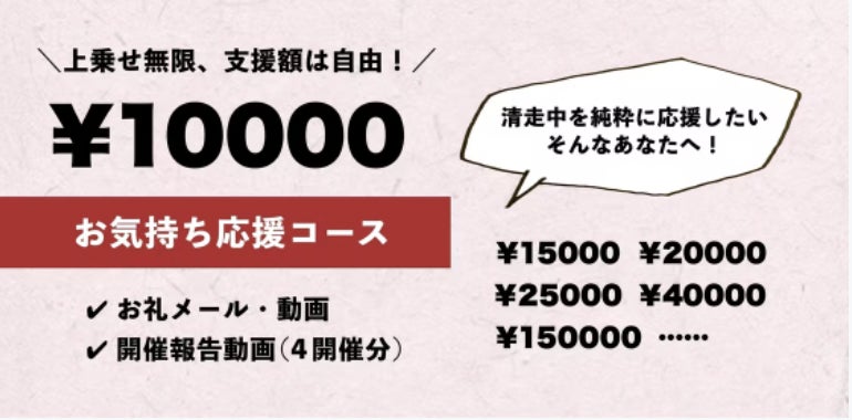 (こちらの10000円以上のお気持ち応援コースをご支援いただいた皆様には、当日の一部始終をまとめた動画をお送りするのでお楽しみに!!!)