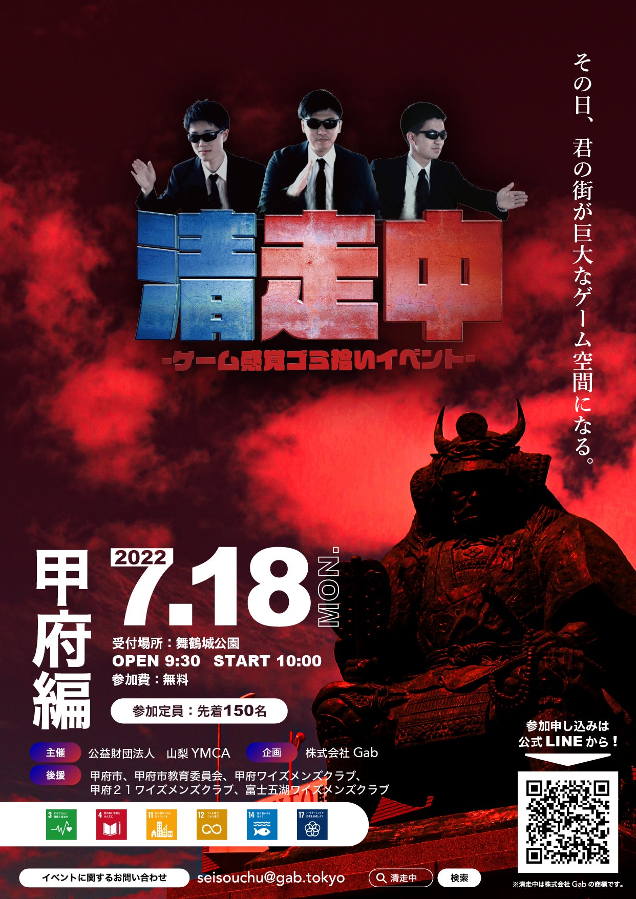 今回ご主催いただく公益財団法人山梨YMCA様(http://www.yamanashiymca.org/)は、「0歳から100歳まで」というスローガンを掲げ、⻘少年向けの野外活動や英会話教室、保育園、学童、障がい児支援から高齢者向けのデイサービス事業まで幅広い活動に取り組まれています。清走中の開催にあたり、老若男女を巻き込み、地域に密着した活動を長年続けられている山梨YMCA様を始め、甲府市SDGs推進課様、甲府市教育委員会様などと広く連携し、昨年武田信玄公の生誕500周年の節目を迎えた甲府市の活性を実現させます!