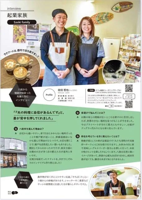 八街市は令和4年4月に市制施行30周年を迎えます。これを記念して、八街市の魅力を広く市内外にPRすることを目的に、八街市移住定住・観光ガイドブック「八街物語/Enjoy!Yachimata」が作成されました。両面表紙で、表面から読めば移住・定住ガイドブック「八街物語」、裏面から読めば観光ガイドブック「Enjoy!Yachimata」と、2つの内容を知って、楽しめる1冊となっており、その中で当店も取材をしていただきました。このような活動の結果として、目標にしていた「食を通じて心の豊かさを提供したり地域に根付きお客様に寄り添う」ことが出来ました。