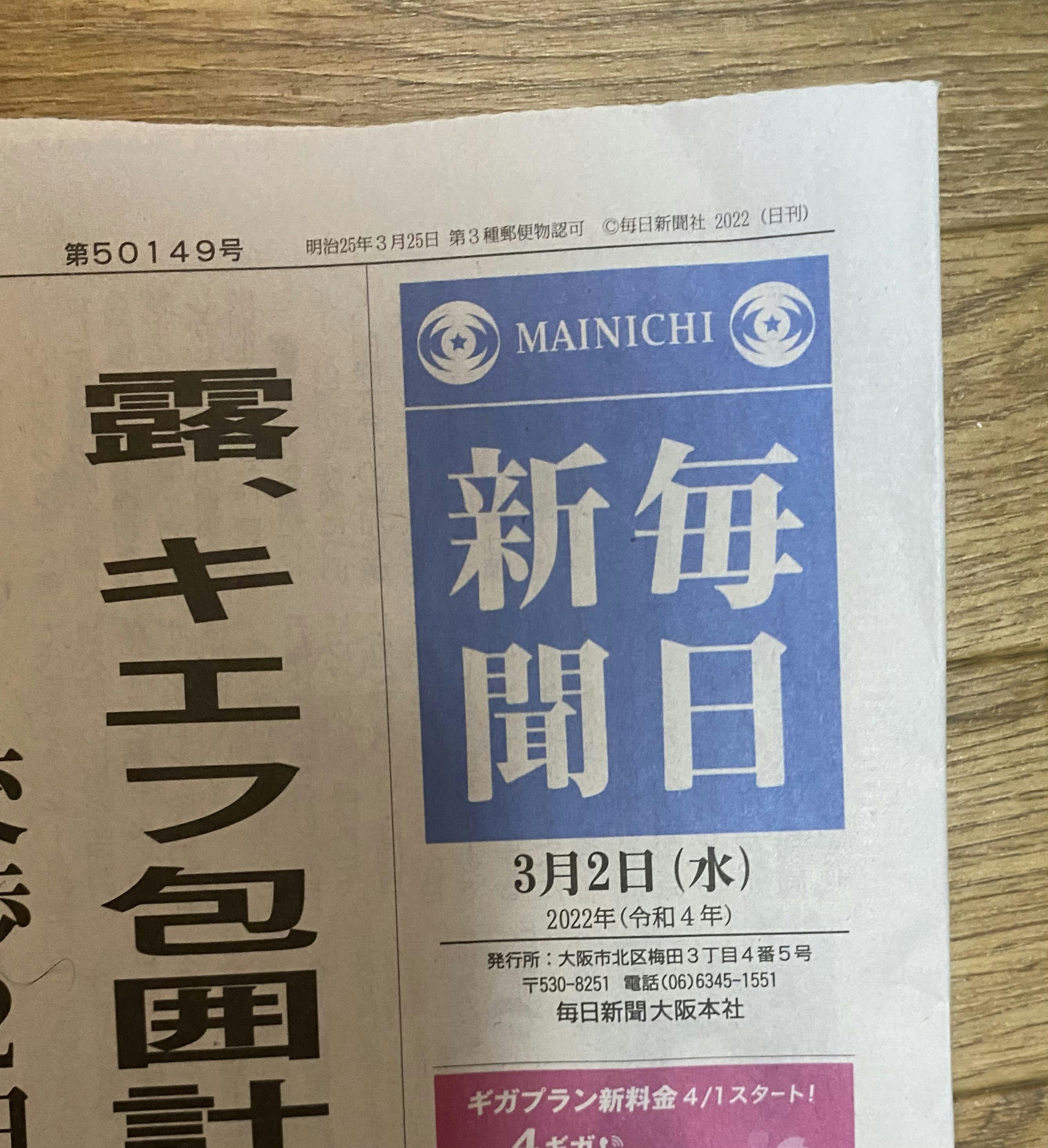 3/2に発刊された毎日新聞に掲載されました♫