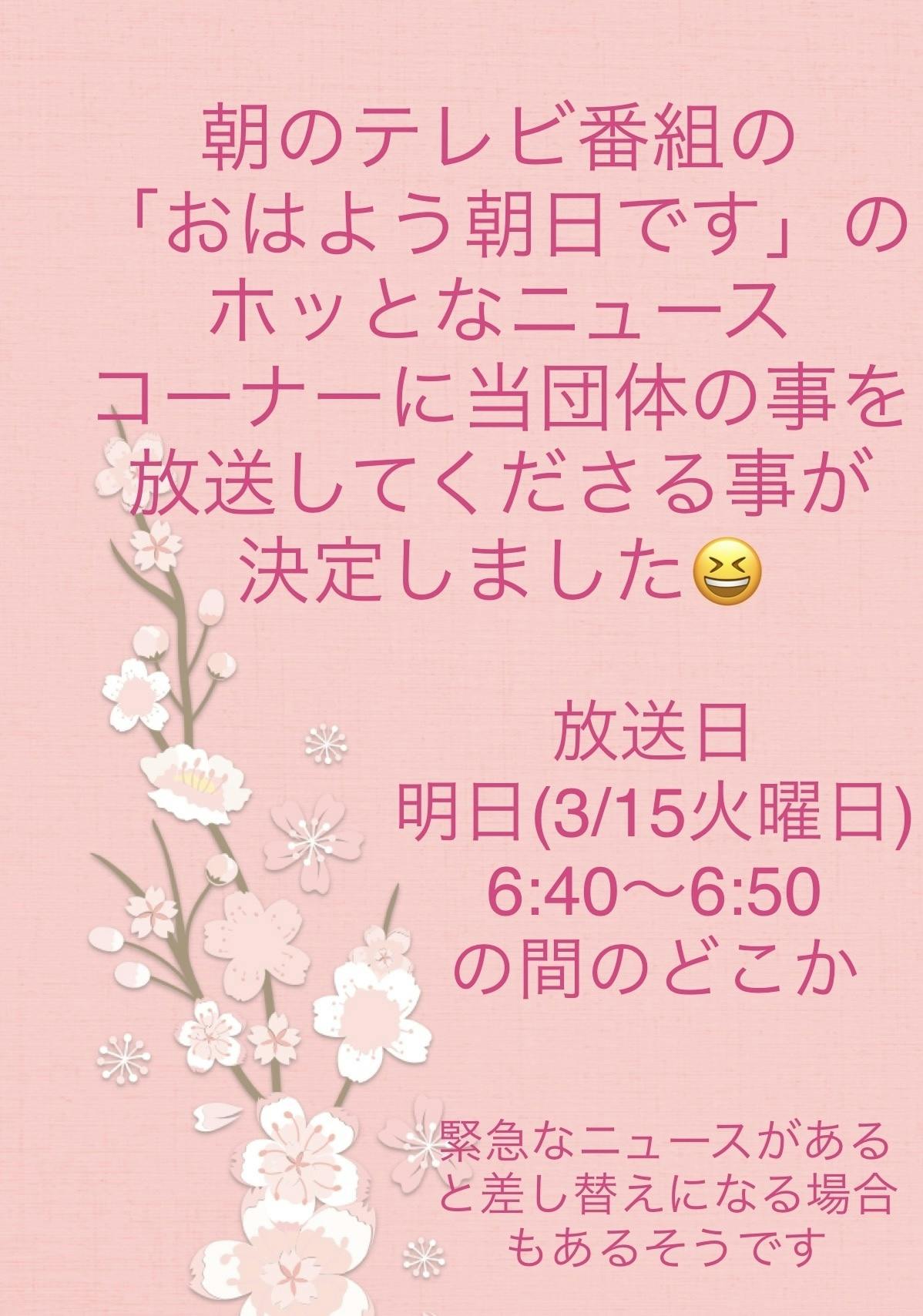 朝の情報番組「おはよう朝日です」のホットなニュースコーナーで当団体の事を紹介してくださるそうです♫