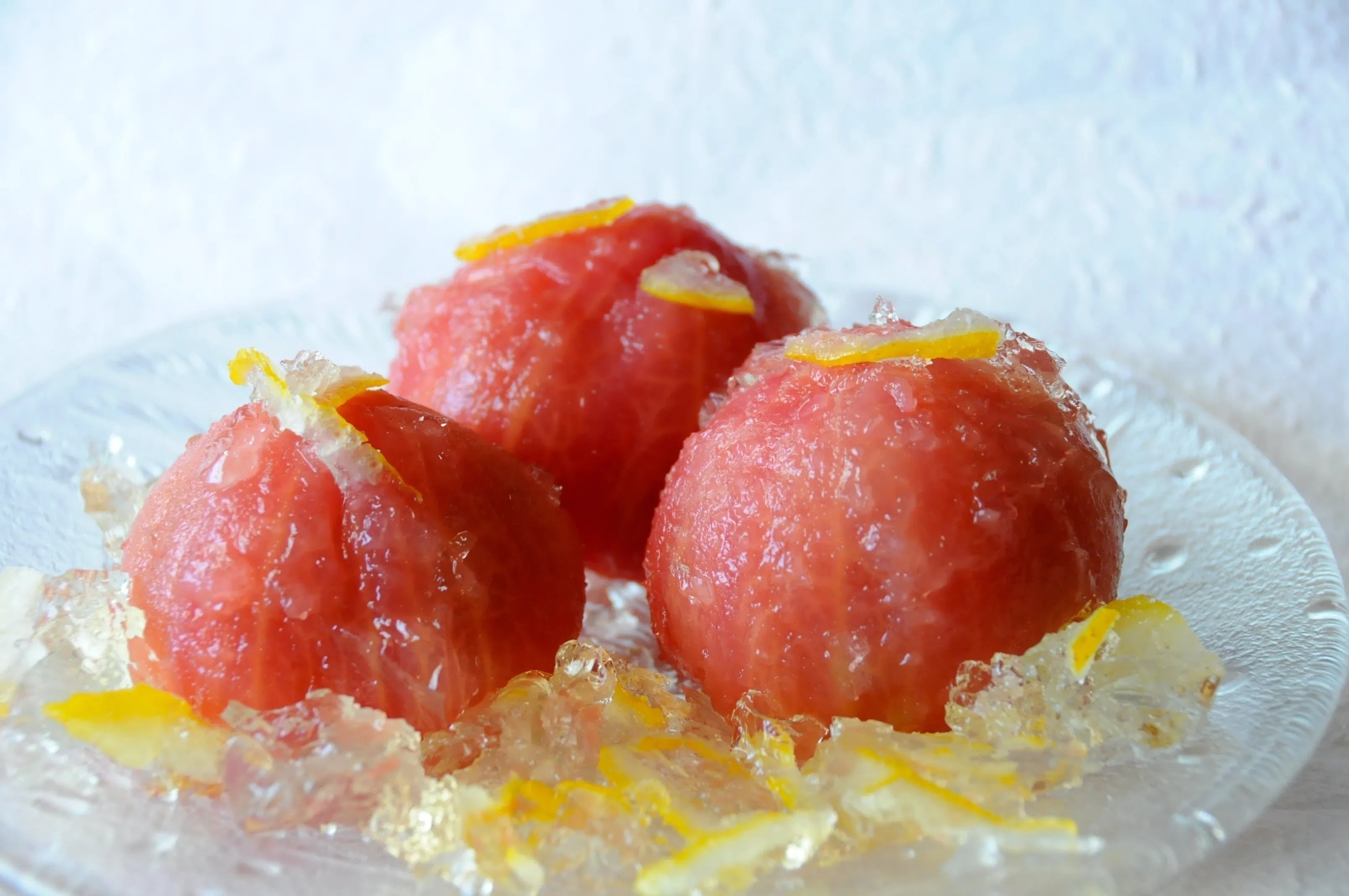 トマトをジェル状の甘酢に漬けた大人気の創作漬物「柚子トマト」