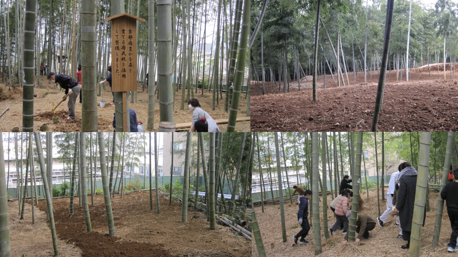 私どもはこの竹害の話を、京都府向日市の物集女竹林を拠点に活動されている「籔の傍」という団体の代表 小関皆乎様より伺いました。「藪の傍」では毎年春にボランティアの方々が幼竹(伸び過ぎたタケノコ)を伐採されています。
