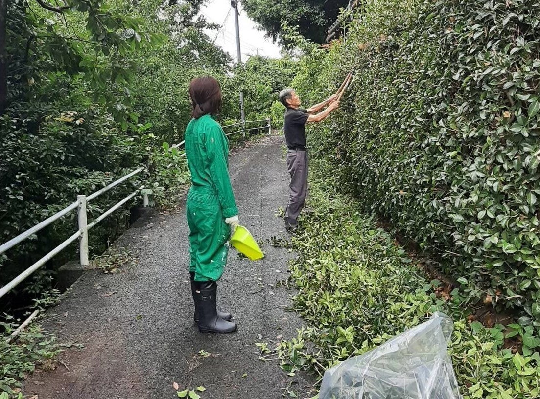 掃除から始めた改修初日。ふらっとのぞきに来られたお隣さんは、剪定を手伝ってくださいました。