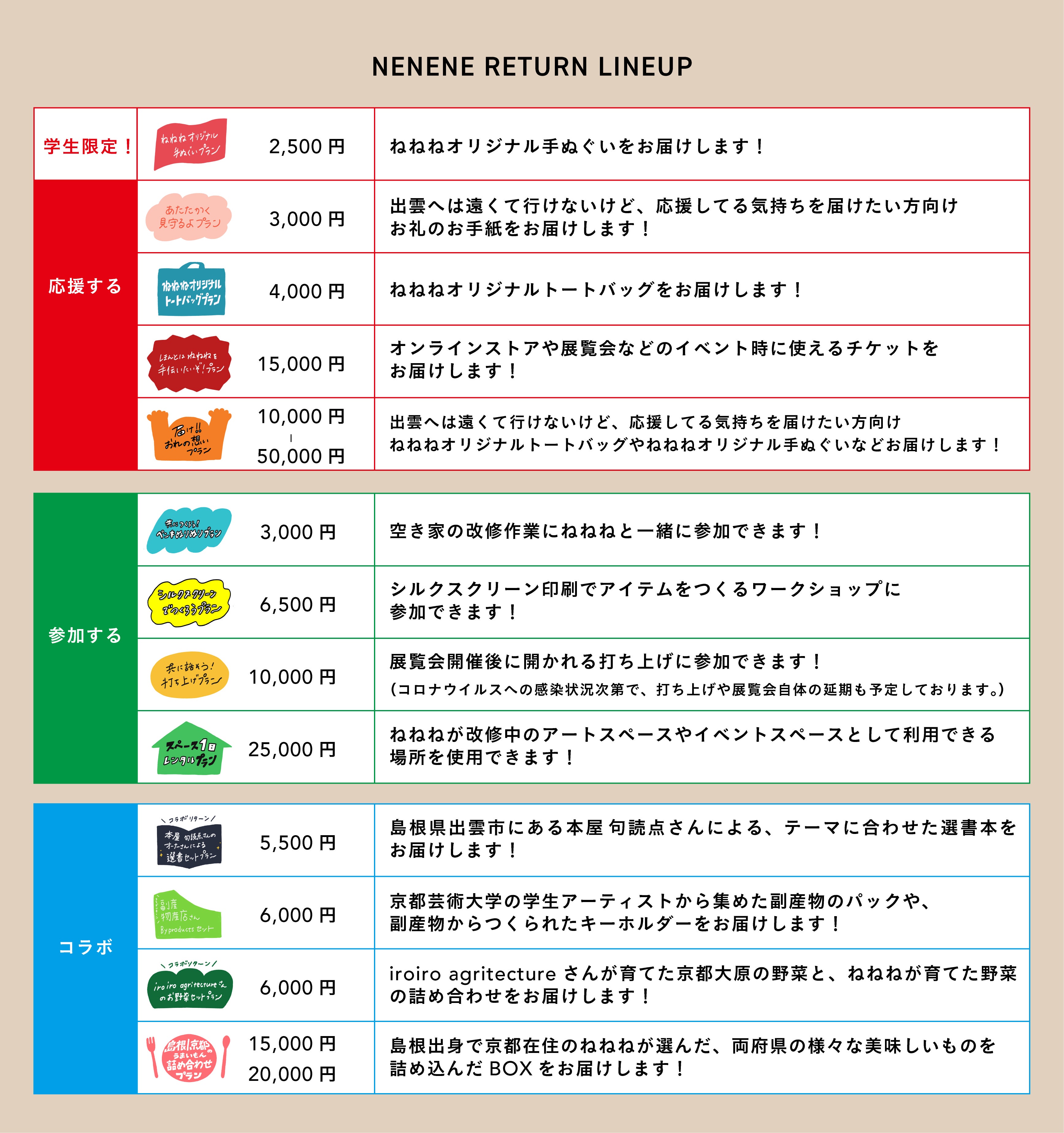 ねねねオリジナルグッズ他、お世話になっているお店様やプロジェクトチームの方々とのコラボリターンもご用意させていただきました!コラボリターンに関しては、コラボさせていただいたお店様やチームの情報も記載させていただいていますので、そちらの方もぜひチェックしてみてください◎