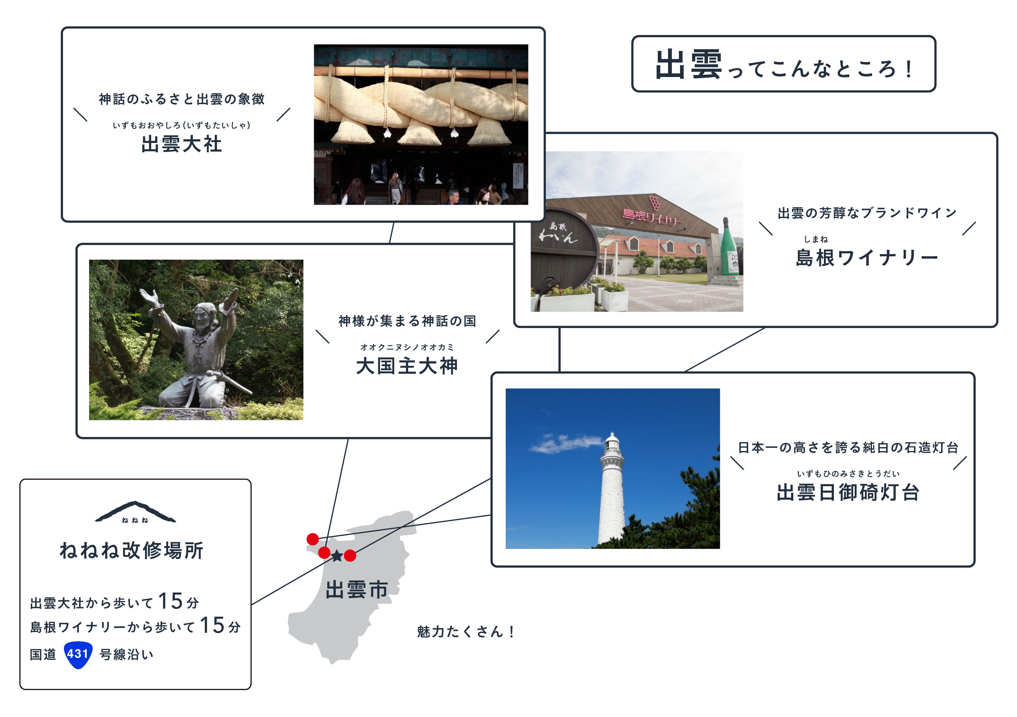 改修している空き家も出雲大社から歩いて15分、島根ワイナリーから歩いて15分の国道431号線に面しており、身近な生活に自然と歴史が溶け込んでいる感覚になります。