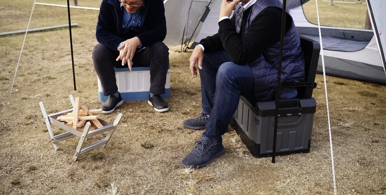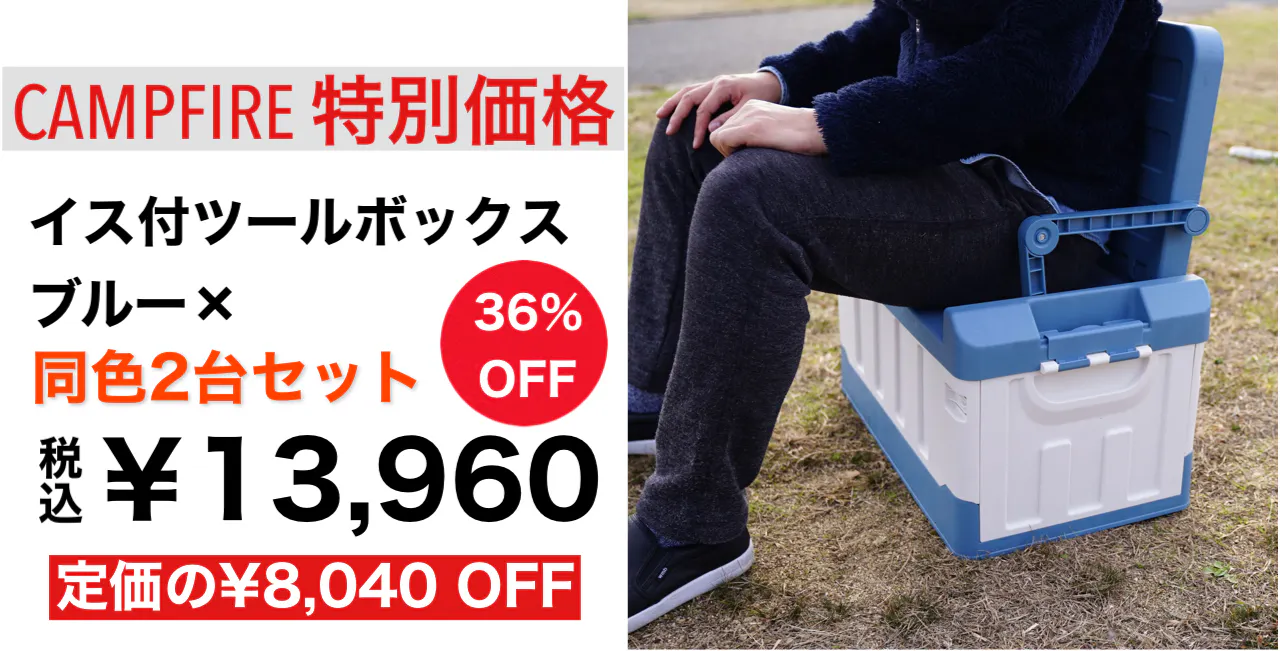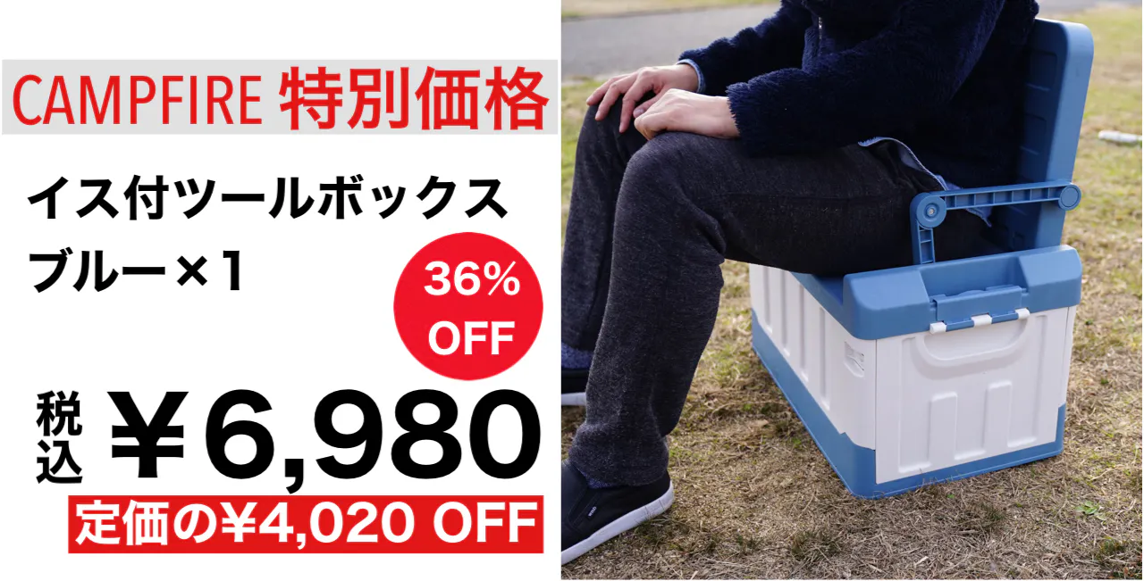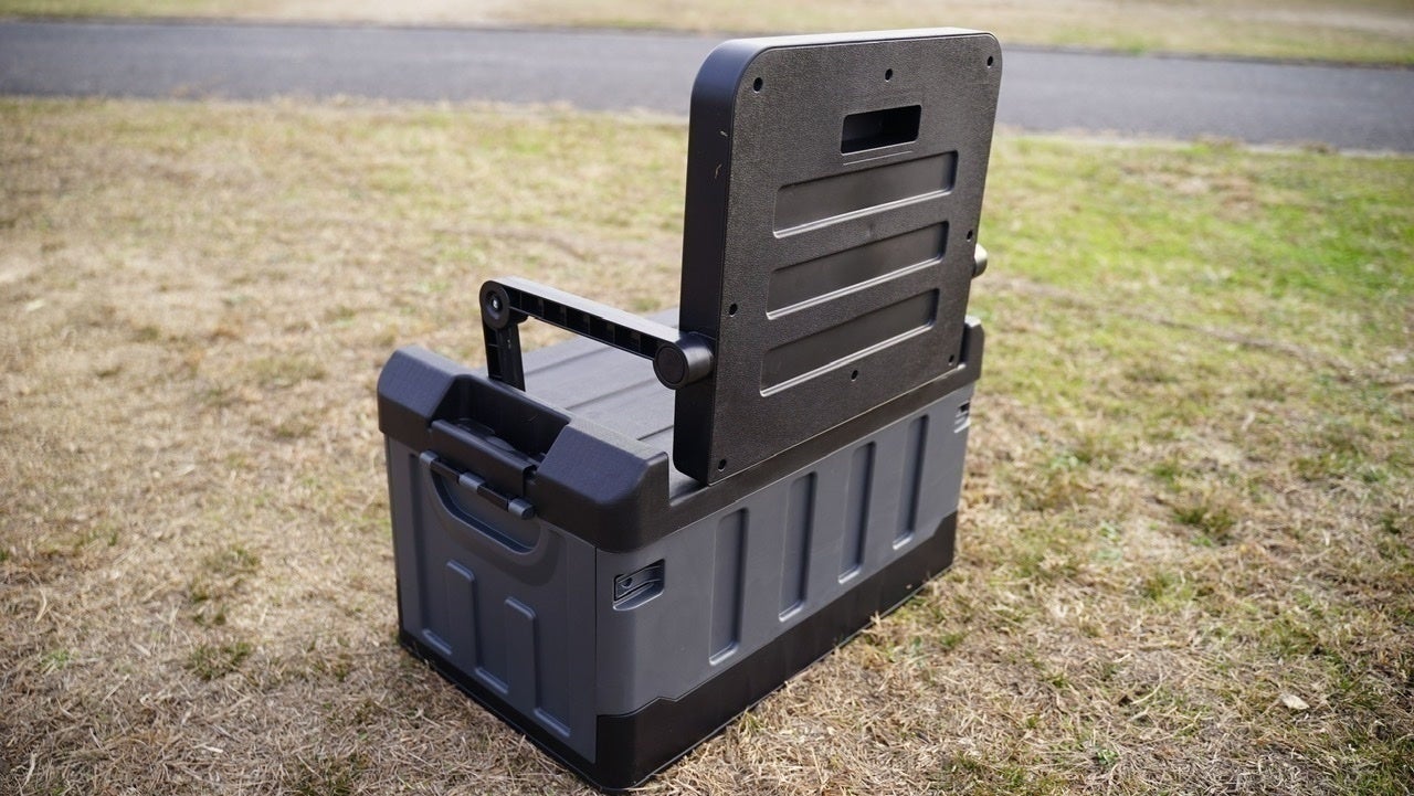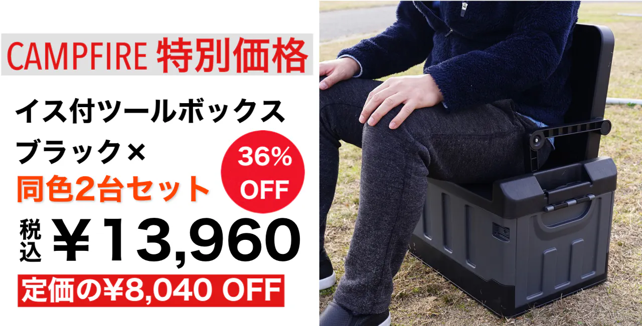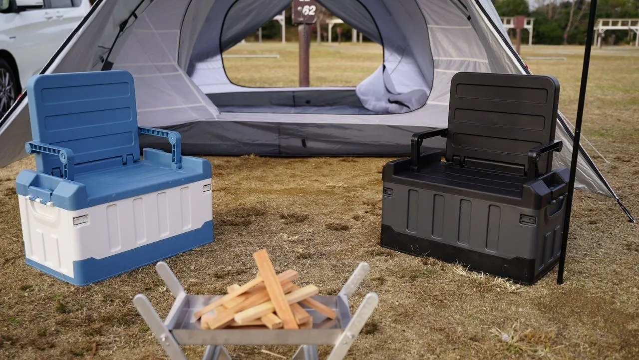 キャンプ道具を収納できるツールボックスに折り畳みのイスを装備。