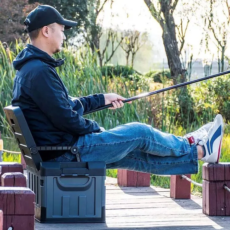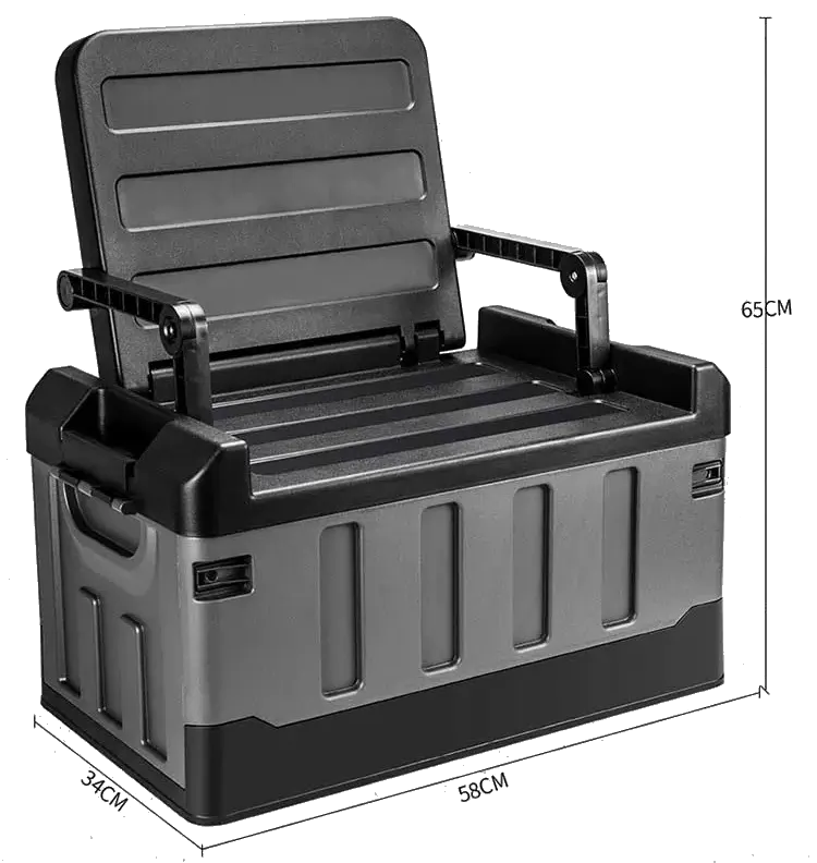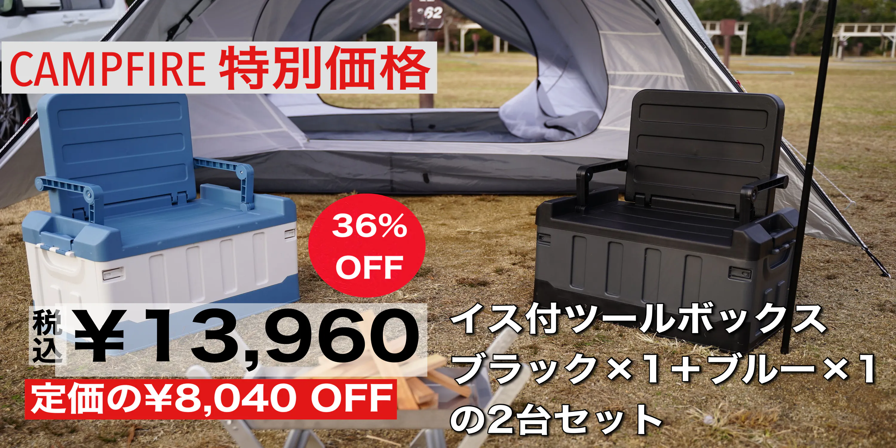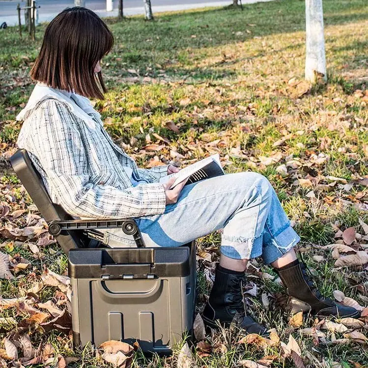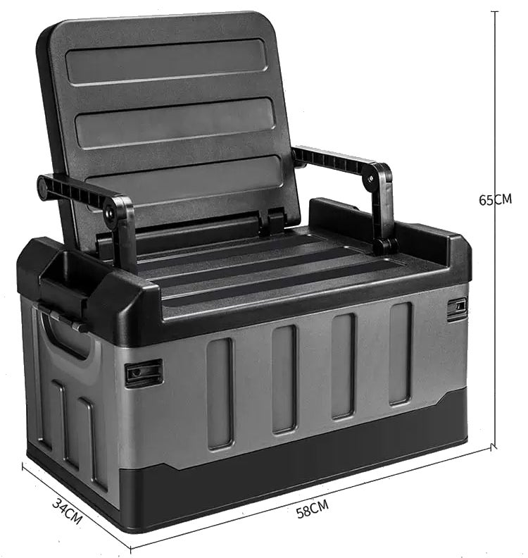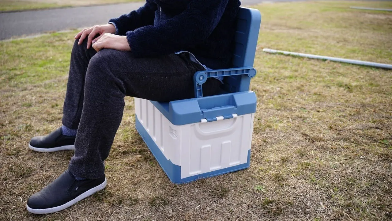 キャンプ道具を収納できるツールボックスに折り畳みのイスを装備。