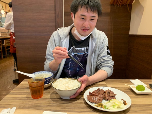 彼にとって大変な一日が終わったので、ご馳走でお祝いしたい気分になりました。彼のリクエストに応えて、牛タン屋へ。