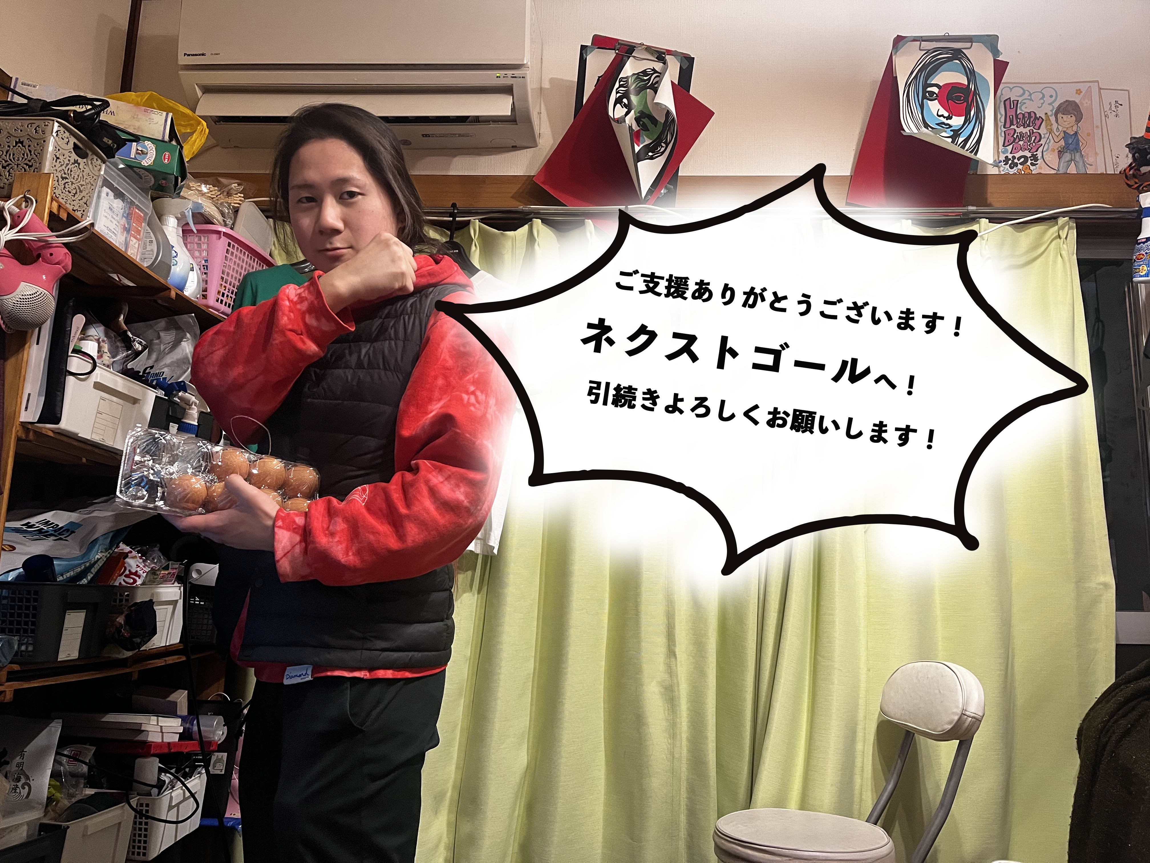 連日のご支援ありがとうございます!皆様の、応援のおかげで開始3日でファーストゴールを達成することができました!住人一同、大変おどろき心より感謝をしています!ご支援いただきありがとうございます!さらに、アジトをたくさんの人に知ってもらえるようにネクストゴールの設定をさせていただきます!ネクストゴールは「100人のアジト仲間をつくりたい!!」とし、支援者数100人をめざします!あと70名ほどの方からのご支援をめざします!ご支援をいただいたあなたは、もうすでにアジト仲間です。もはや家族といっても過言ではありません。つまり家族を増やしたいです。もともと、このプロジェクトを通して、「アジトに関わってくれる人を増やして、アジトを通しての新しい出会いを作りたい」「アジトをたくさんの人に愛されるシェアハウスとして長く続けていきたい」という想いがあります。新しい出会いは、時としてその人の生き方を変えるきっかけになります。実際に、アジトに住んだことをきっかけに結婚した元住人もいます……!私自身も、シェアハウスという暮らし方を知り、大きく生き方が変わりました。たった5人からスタートしたアジトに100人の仲間をつくり、たくさんの人にアジトに遊びに来たり、住んでもらえたら嬉しいです!100人の仲間に、より快適な空間で過ごしてもらいたい…これから増えていく住人に快適に過ごしてもらいたい…その環境づくりのために、さらなるご支援をいただけたらうれしいです。追加のリターンもご用意しましたので、ぜひよろしくお願いします!プラス3万円で……追加リターン①カーテンが防音になります!!100人集まっても大丈夫!ご近所に迷惑をかけないように…音漏れを防ぎます。プラス5万円で……追加リターン②壊れかけの、いつ倒れてきてもおかしくないリビングの棚を新しくして、崩壊の危機から住人やアジトに遊びにくる人を守れます。こちらは中野くんに追加オーダーをする予定です。中野くんの仕事が増えます!プラス6万円で……追加リターン③リビングの古くなって寝心地が微妙なソファベッド1台を新しくできます!こちらは、ゲストさんが来た時に寝る場所として使っているので、ゲストが来た時に快適な眠りにつけるようになります!トータルプラス14万円で上記の全てが叶い、あなたがアジトに遊びにきた時、ちょっと大きな声で笑っちゃってもクレームが来なくなり棚崩壊の恐怖に怯えずに楽しく過ごすことができるようになりうっかり終電を逃して、アジトで寝ることになっても快適!!!!という未来が待っています。ぜひ、100人の仲間を迎え入れるための快適なアジトを作るために、さらなる応援をよろしくお願いいたします!