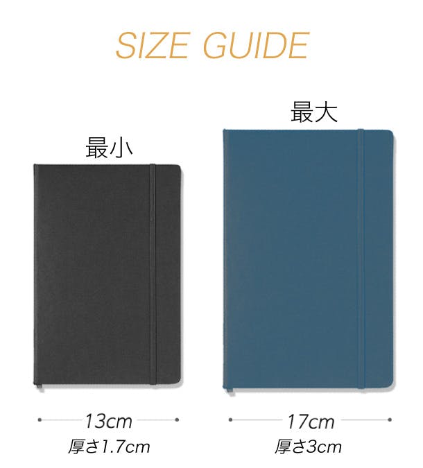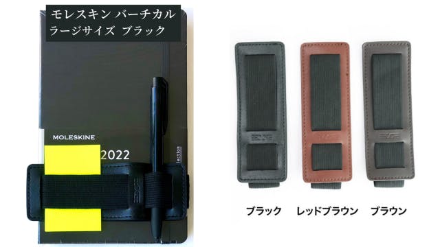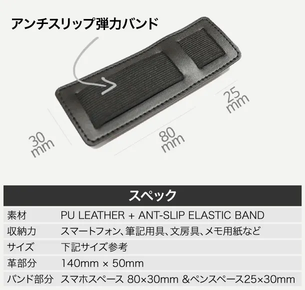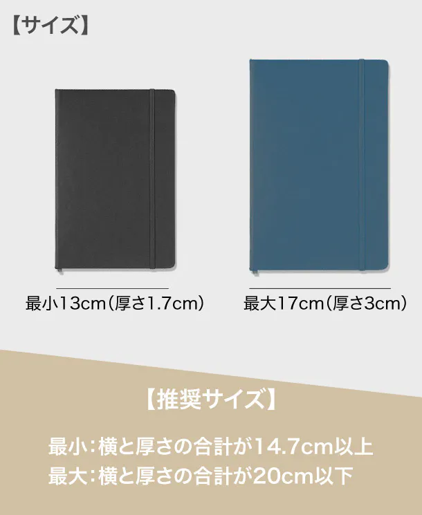 A:最大推奨サイズは17cm×3cmで、一般的な手帳に装着可能です。ゴムの長さは最大横幅25cmまで伸びます。それ以上はペンや手帳のサイズによって異なります。