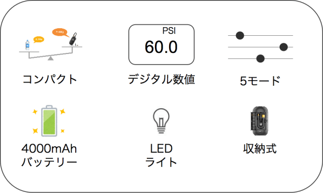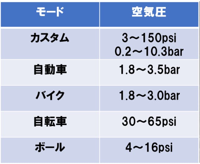 空気充填モードは、自動車、バイク、自転車、ボール、カスタムの5種あり、対象に合わせ適切な目標空気圧を設定可能です。