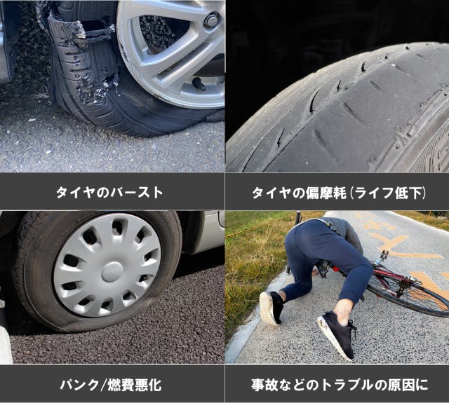 タイヤの空気圧は、しっかり点検・管理しておかないと、以下のような重大なトラブルにつながる恐れがあります。