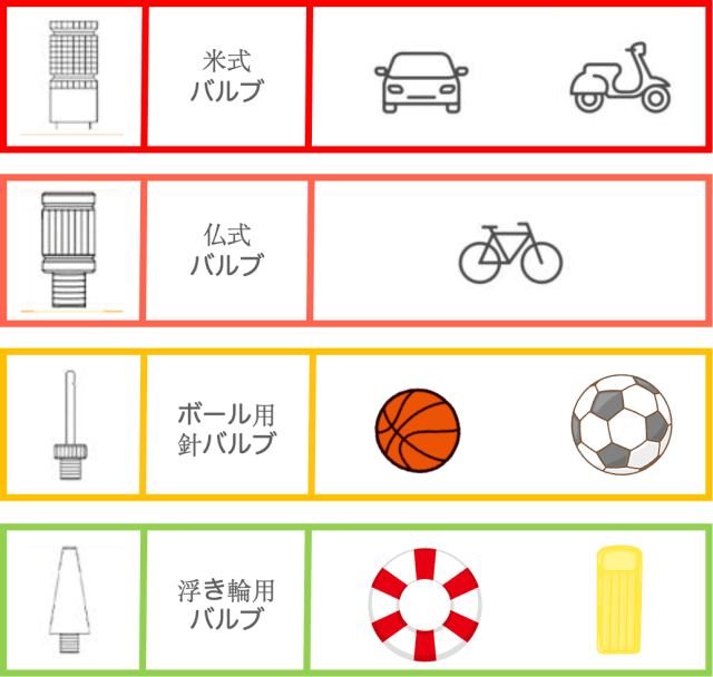 ※ホース備え付けの米式バルブ以外に、仏式バルブ、ボール用針バルブ、浮き輪用バルブの計3種類のバルブが付属しています。
