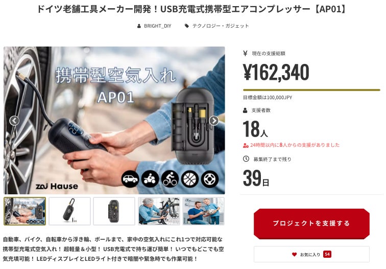 この度は「ドイツ老舗工具メーカー開発!USB充電式携帯型エアコンプレッサー【AP01】」にご支援頂き誠にありがとうございます!