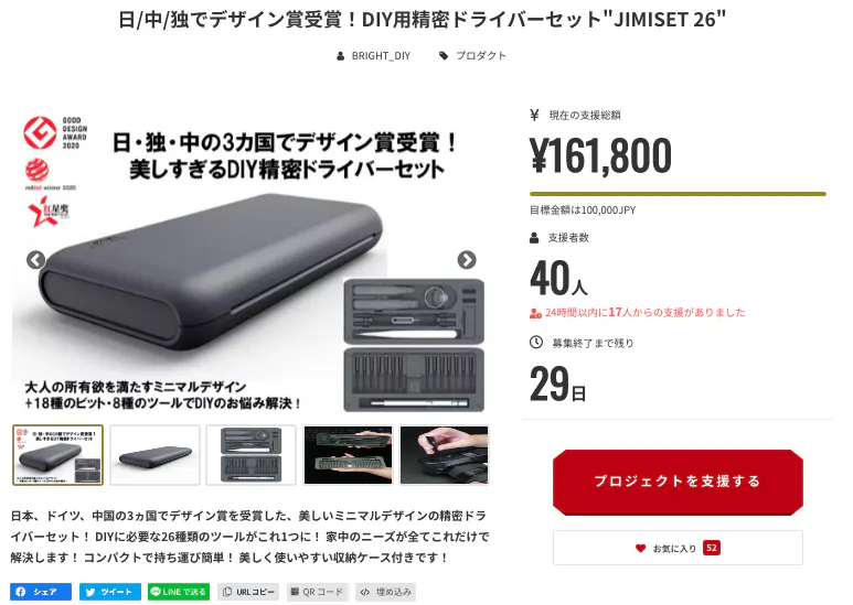 この度は「日/中/独でデザイン賞受賞!DIY用精密ドライバーセット"JIMISET 26"」にご支援頂き誠にありがとうございます!