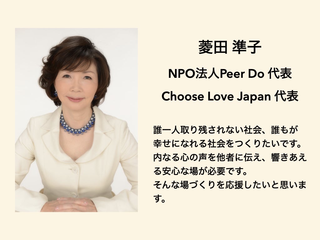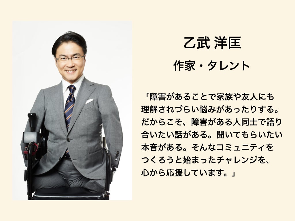 東ちづる(俳優・一般社団法人Get in touch代表)、武田双雲(書道家)、乙武洋匡(作家・タレント)、榎本重秋(ぜんち共済株式会社 代表取締役社長)、菱田準子(NPO法人Peer Do 理事長)、坂本慎治(NPO法人生活支援機構ALL 代表理事)、牧野英彦(一般社団法人ライフワーク協会 代表理事)、谷本吉紹(株式会社エースタイル 代表取締役社長)