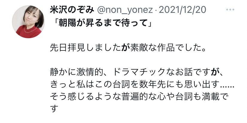2022/12/31 15:23映画「朝陽が昇るまで待って」クラウドファンディングすべてのご支援リターンの送付がまもなく完了いたします。皆様、2022年も暮れようとしておりますが、いかがお過ごしでしょうか。今年3月に目標金額達成でフィニッシュさせていただきました映画「朝陽が昇るまで待って」の上映会は、11月18日~20日に無事に実現させることができました。本当にありがとうございました。「朝陽が昇るまで待って」の続編でもあり、アンサーとも呼べる完結編「夕陽が沈んだら僕は」の予告編をお送りします。https://youtu.be/xRZ6h_aijTsこちらは12月22日・23日にお披露目上映会が行われました!塚本凌生さんもご登壇いただき、久々の再会☆(お客様撮影:塚本凌生さん・松谷鷹也)そして生芝居の好評を得て急ピッチで映像化された「Grand Gray You Love」のロング予告がこちらです。https://youtu.be/FMU4j2FD6mg12月22日・23日に行われたお披露目上映会では、「朝陽」「夕陽」に続き、こちらも大変ご好評をいただきました。(お客様撮影:松谷鷹也・小貫莉奈さん・石塚ヒカリさん・塚本凌生さん)(お客様撮影:朗読「サンタクロースっているんでしょうか?」塚本凌生さん・松谷鷹也・小貫莉奈さん)「朝陽が昇るまで待って」「夕陽が沈んだら僕は」「Grand Gray You Love」3作を収録したDVDの販売希望もいただきましたので、来年以降での発売を計画したいと考えております。引き続き、応援いただけましたら幸いです。映像リターンのお客様には、本日、URLにて特典映像を送付させていただいております。(55555リターンのメイキング映像につきましては、今しばらくお待ちください)また、オリジナルロンT、サイン入りパンフレット及びポスターに関してましては既に郵送手配済ですので、年明けの到着となります。今年一年、様々なことがあり、2022年3月のクラウドファンディングから約9か月経っての、ようやくのリターン完了となりました。サポーターの皆様をお待たせしてしまったことに心からお詫び申し上げますと共に、根気強くお待ちいただき、変わらぬご声援を送ってくださった皆様には、感謝が尽きません。本当に本当にありがとうございました。モザイク東京は裏側の活動である「東京モザイク」の躍進も受け、来年から中井由梨子の世界をさらに凝縮させ、表現し、伝えていけるよう頑張っていきます。これからもよろしくお願いいたします。(お客様撮影:松谷鷹也)どうぞ良いお年をお迎えくださいませ。モザイク東京 主宰 中井由梨子俳優 松谷鷹也 もっと見る