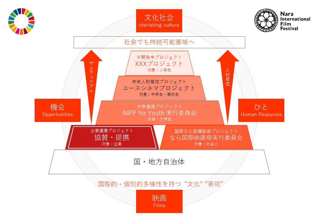 多くの映画祭は、この図で言う土台の部分、国・地方自治体と、企業、実行委員会との連携までです。しかしなら国際映画祭では、ユースシネマプロジェクトに参加した中・高校生が大学生になり、自分たちも映画祭に関わりたいと言ってくれてNIFF for Youth実行委員会が立ち上がり、世代を一気通貫したサスティナブルな連携がとれるようになってきています。