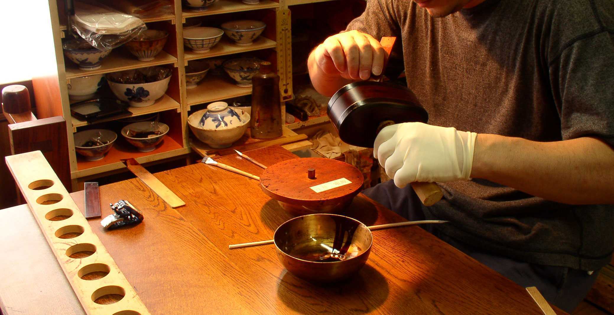漆を太陽光に当てながら、適切な粘度と色味に生成する職人もいます。