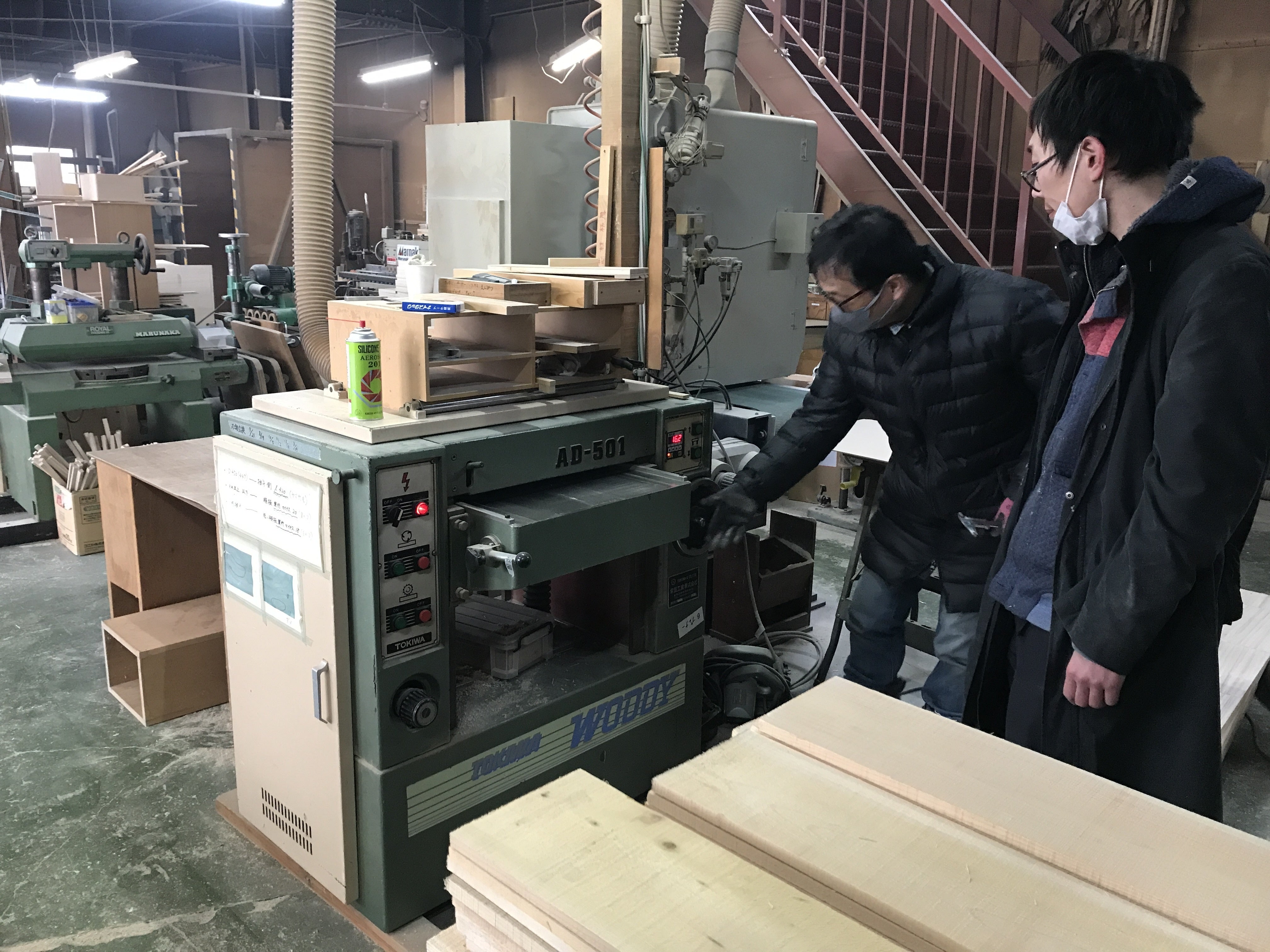 2022/03/29 21:58「土に還る」ことを大切にしているとおいちでは、お店の改修でもできるだけ、無垢材や紙などを利用し、集成材などを避けるようにしています。でも、それを現在の産業構造の中で行うのは難しい。簡単に施工をしてもらうとしたら合板を使うことになるし、施工工程が見えない蓋をする施工の方が楽。しかしながら、多少面倒でも、施工を可能な限り自分たちで行うことで、一つ一つの内部空間を丁寧に設えました。主として使ったのは、サワラのジョウコ材と言われる、いわゆる、丸太の一番外側で、主たる製材の余りで作られるものです。厚みが12mmくらいで2000mmの長さ、幅150くらいで、使い勝手は限られてしまうのですが、合板を使うのと変わらない価格帯で入手できます。そこで、このジョウコ材の使い方を考えることで、色々な利用方法ができないかと工夫をしました。カンナをかけると、綺麗な木目が出てきます。手をかけると、いろんな工夫ができる。あと、重厚感が欲しいところは木曽檜を使いました。そこで今回は、木曽平沢にある「大河内家具工房」をお借りして、切りそろえやカンナがけ、張り合わせ作業などを行いました。工房内観。種々の機材が揃う。長さを揃えて切り出しカンナをかけるとピカピカに!プレスして2枚を張り合わせ、棚板を作成。棚板には機械で刻みを。そんなこんなで切りそろえた部材をはめて、表は商品陳列、裏は作業スペースという二つの空間を隔てる緩い境界を作りました。さらに、店奥のギャラリースペースの壁もサワラで仕上げました。その上には、みんなの手作業で、でんぷんのりで和紙を貼りつけ。マイルドな表情に仕上がりました。もともとあったトップライトを生かした展示空間になりそうです。現場作業もあと少し!頑張ります〜。 もっと見る
