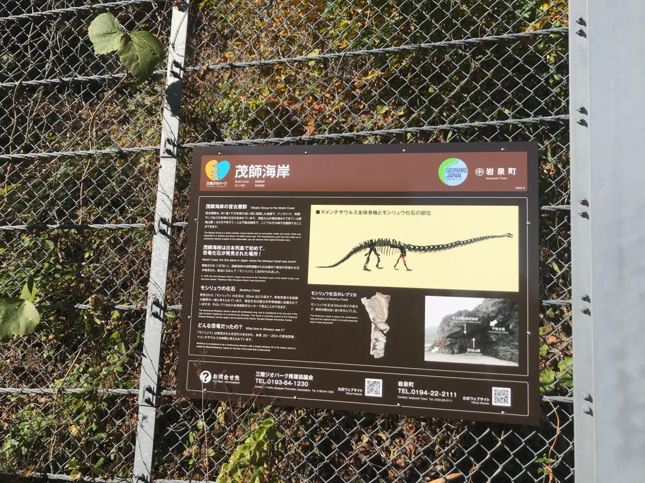 【 小本港 シーカヤック体験 】三陸ジオパークとしては、地質学界では日本で恐竜の化石が見つからないとされていたが1978年に小本茂師(もし)にて地球最大の陸生脊椎動物のマメンチサウルスに類似した上腕骨が発見された歴史的にも非常に希少価値が高い場所がある。恐竜は発見地にちなみ【 モシリュウ 】と名付けられた。