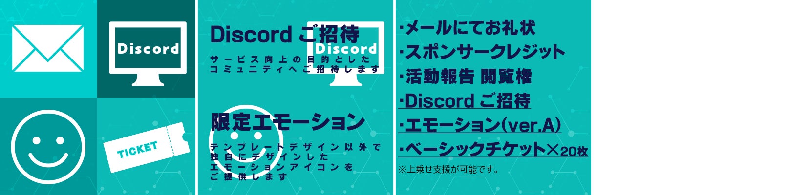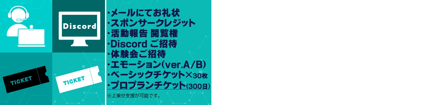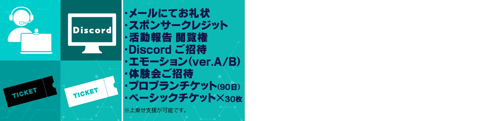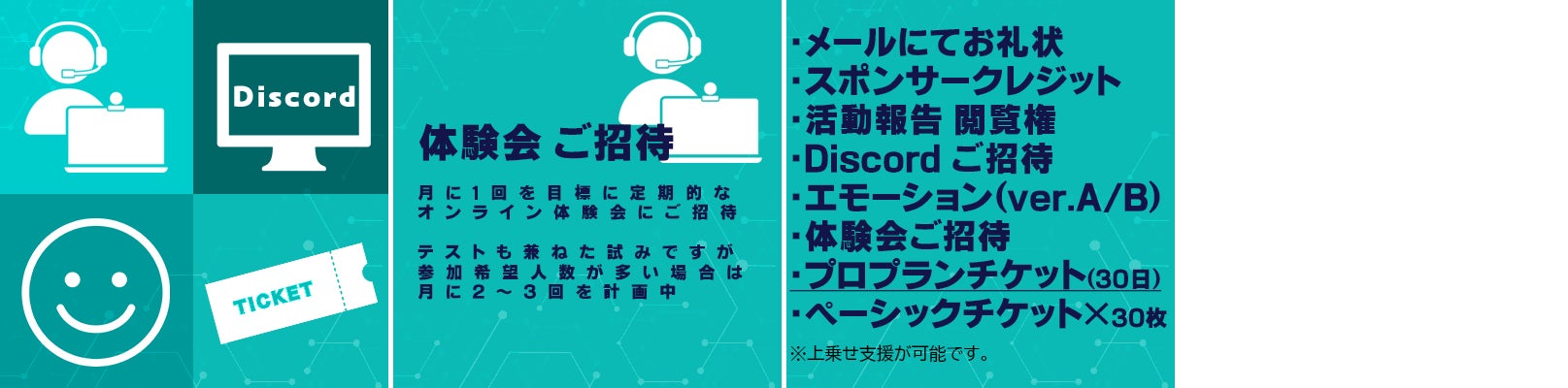 ・メールにてお礼状・スポンサークレジット ・活動報告 閲覧権・Discord ご招待・体験会 ご招待・限定エモーション:Ver.A/B・ベーシックチケット:30枚・プロプランチケット:90日(有効期限:チケット消費後90日間)