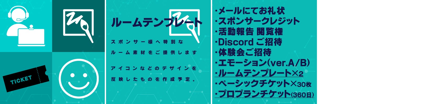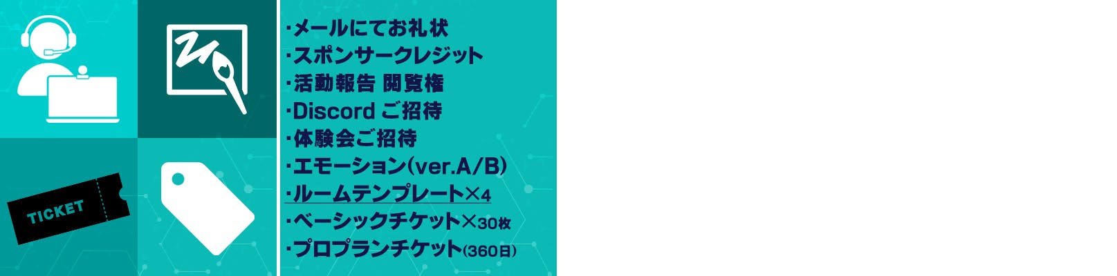 ・メールにてお礼状・スポンサーバナー※支援時、必ず備考欄にご希望のお名前をご記入ください・スポンサークレジット・活動報告 閲覧権・Discord ご招待・体験会 ご招待・限定エモーションA/B・ルームテンプレート:6個・ベーシックチケット:30枚(有効期限:1枚消費毎に1時間)・プロプランチケット:360日(有効期限:チケット消費後360日間)