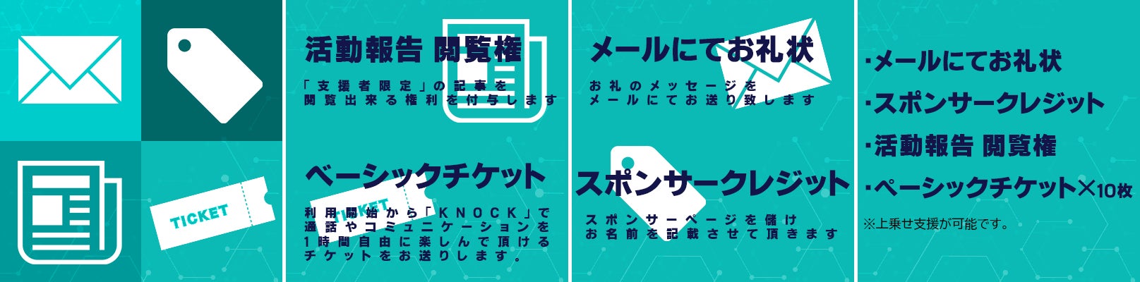 ・メールにてお礼状・スポンサークレジット※支援時、必ず備考欄にご希望のお名前をご記入ください・活動報告 閲覧権・ベーシックチケット:10枚(有効期限:1枚消費毎に1時間)