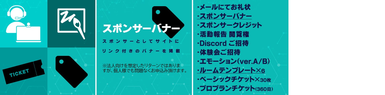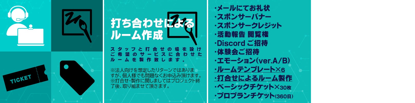 ・メールにてお礼状・スポンサーバナー※支援時、必ず備考欄にご希望のお名前をご記入ください・スポンサークレジット・活動報告 閲覧権・Discord ご招待・体験会 ご招待・限定エモーション:Ver,A/B・ルームテンプレート:6個・打ち合わせによるルーム製作・ベーシックチケット:30枚(有効期限:1枚消費毎に1時間)・プロプランチケット:360日(有効期限:チケット消費後360日間)