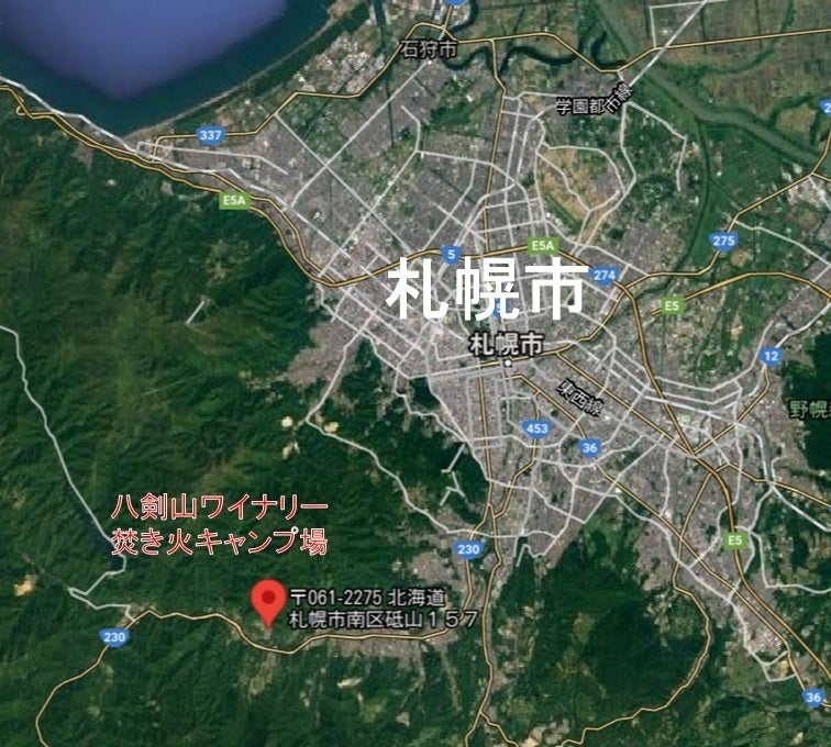 キャンプ場の最大の特徴はアクセスの良さ。札幌と洞爺湖や道南を結ぶ国道230号線、1日1万台以上通行する道内主要交通路のすぐそばにあります。札幌の奥座敷といわれる「定山渓温泉」は、この国道をとおって札幌市街から約50分の距離ですが、途中右手にステゴザウスルの背中にたとえられる八剣山の特徴的な山稜を、間近に望むことができます。千歳空港からは道央道をとおって約1.5時間の快適なドライブです。