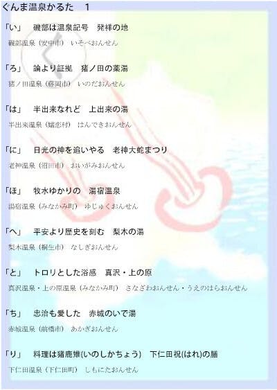 群馬各地の温泉地を知っていただける「ぐんま温泉かるた」を作成し、広く温泉地を知ってもらうことで、おんせん県群馬 の”障害者・高齢者の方々に湯治場としてご利用いただける温泉地”を守りたい。