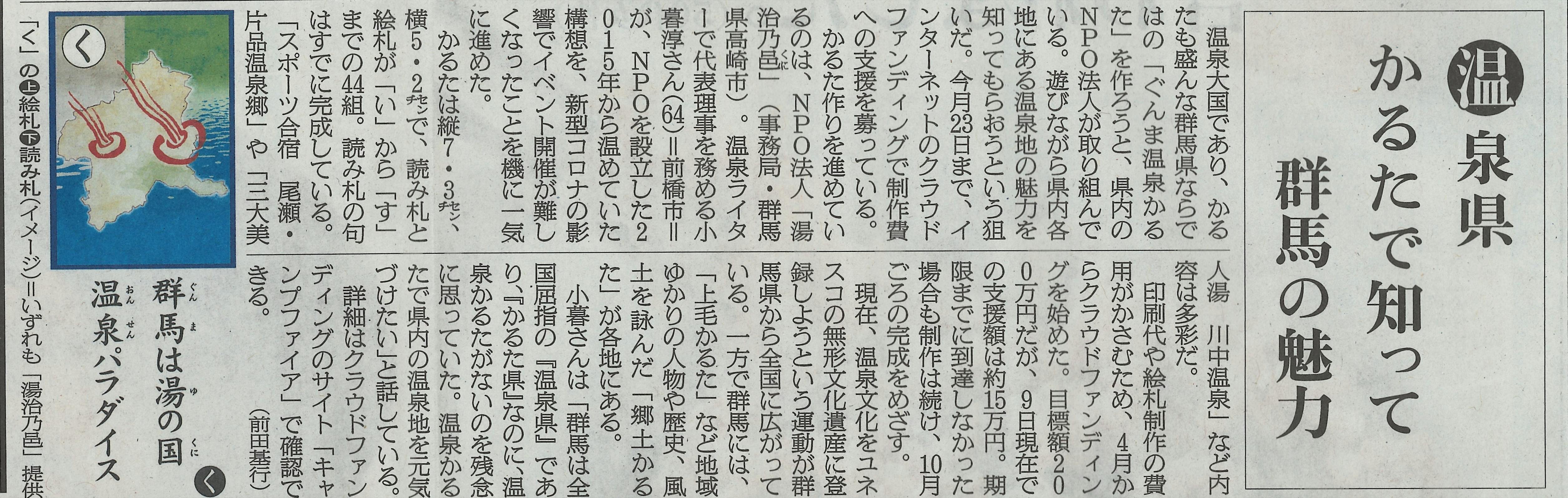 2020年のコロナ禍に伴い、パネルディスカッションなどのイベント開催が難しくなったなか、理事会のなかでなにかできることはないかと検討を重ね、「ぐんま温泉かるた」を作成する事業を実施することとなり、そのための資金としてこのプロジェクトを立ち上げました。