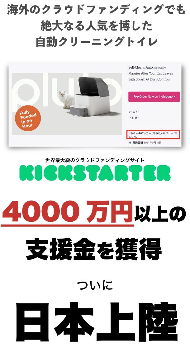 KickstarterとIndiegogoで約4,200万円を売り上げた自動クリーニング猫トイレ「Pluto Square」を紹介します。