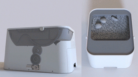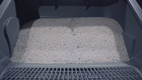 Pluto Squareが自動でトイレ内をクリーニングしてくれます。ゆりかご状のトイレ部分が固まったサンドだけをダストボックスに落とします。振るいにかけられたダストは次の用足しに備えてまた元通りに戻ります。