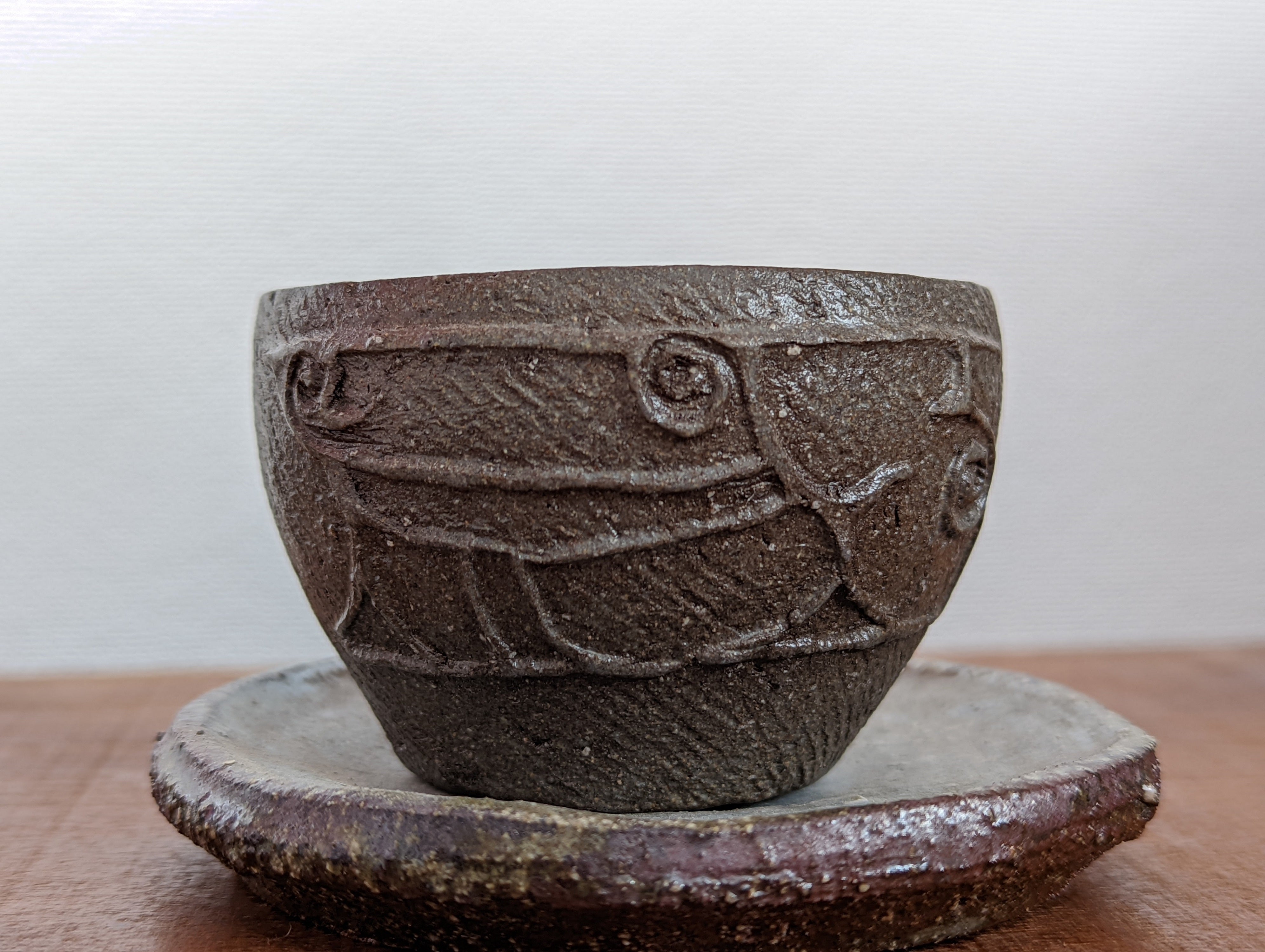 西ノ前遺跡の土器文様からインスパイアされたカップです。青苧で綯った縄で全面に縄文を施し、本焼きで仕上げてます。現代の生活の根底には、縄文が眠ってる。太古の記憶を蘇らせてくれるカップ&ソーサー。