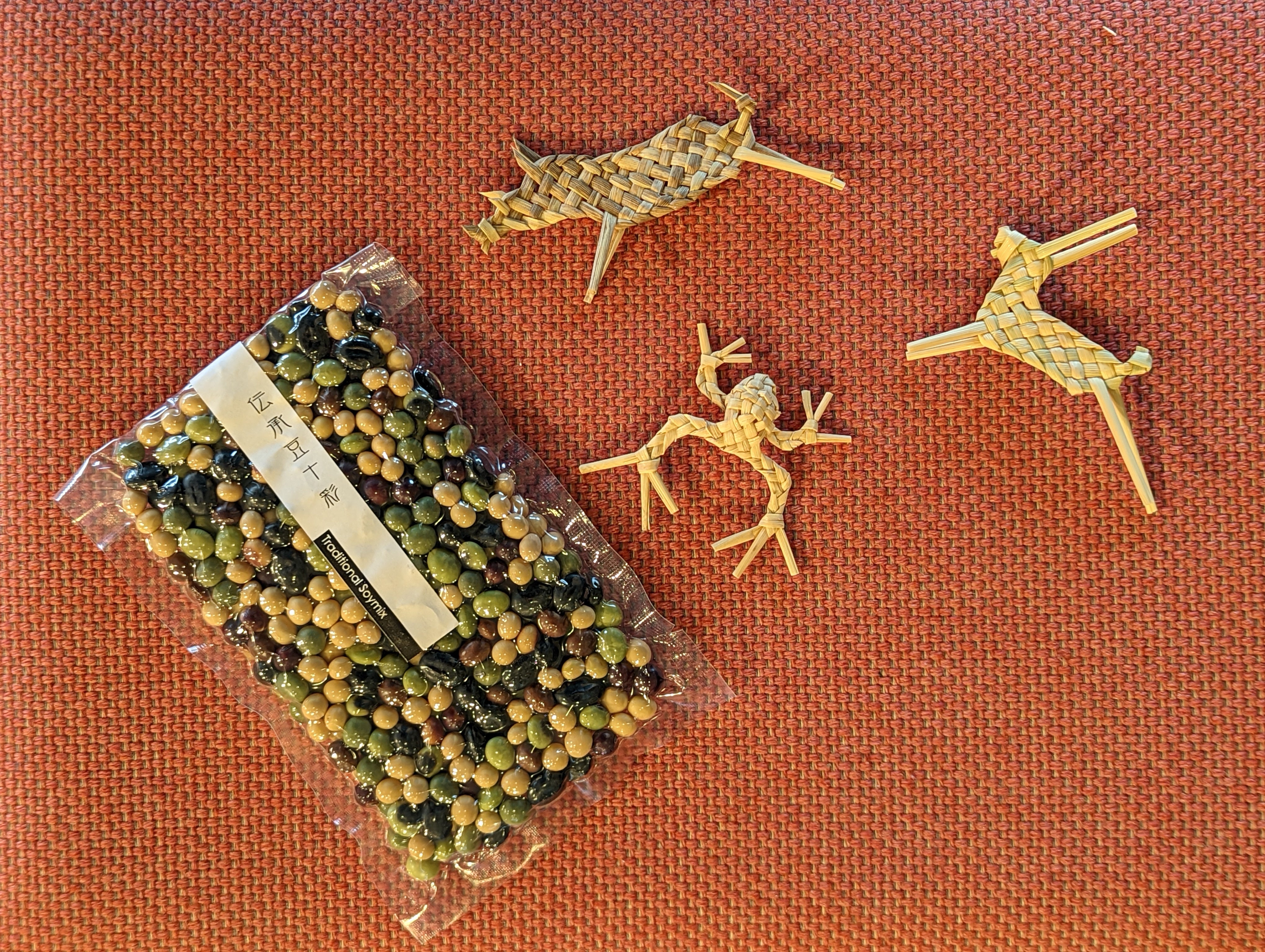 猪、兎、蛙のわら細工と、伝承豆セット。