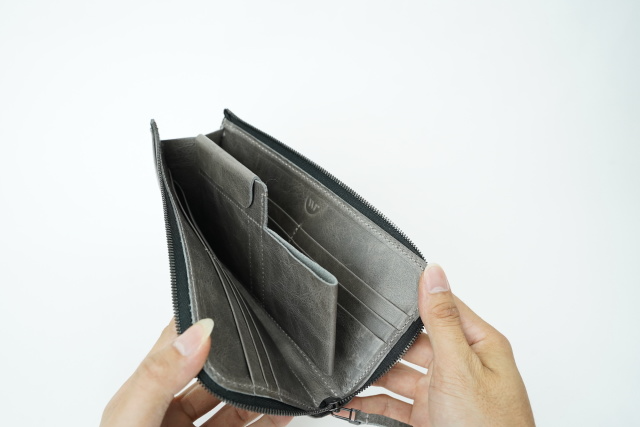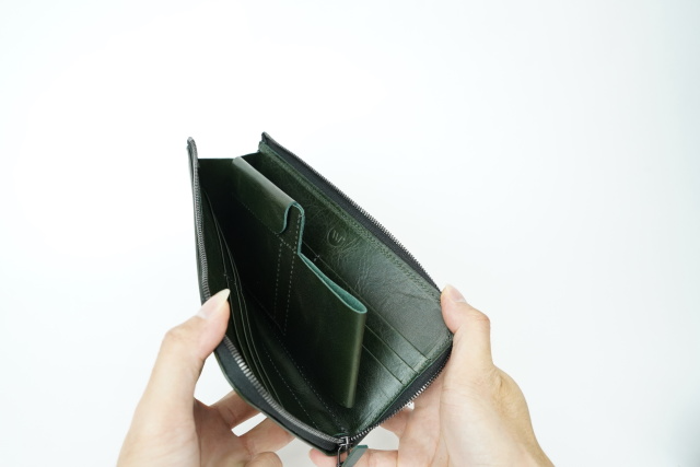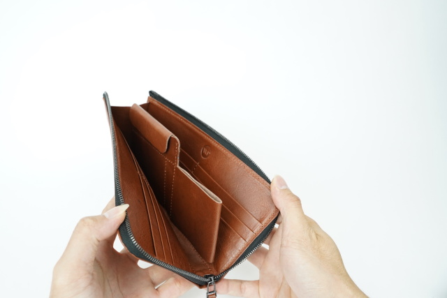 L字ファスナーを開いた瞬間に財布内部全体が見渡せる設計なので、どこに何があるか瞬時に判断することができ、出し入れをとってもスムーズに行うことが可能!