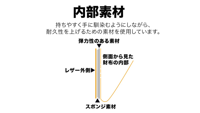 内側の芯材には弾力性に優れた素材を使うことで、中身を多く入れた時の形崩れや膨張防止と強度アップ。さらに、スポンジ素材を重ねることで優しく柔らかい手触りを生み、革の表面が平たくチープに見えない効果にも繋がっています。
