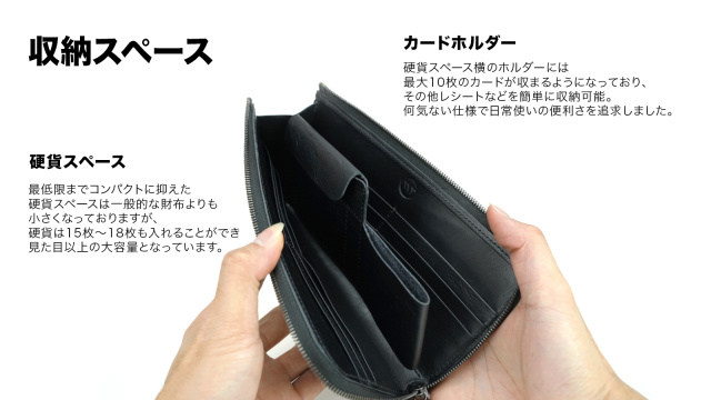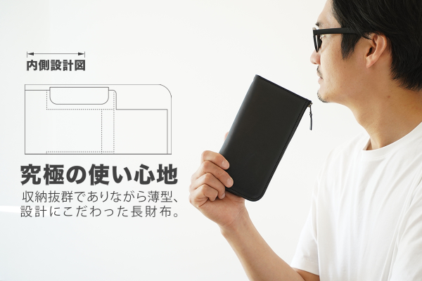 長財布の特徴である収納力を落とさないギリギリのラインで、年齢や性別・カジュアル or フォーマルなど問わず、様々なスタイルに向けたちょうど良いサイズ感を目指しました!