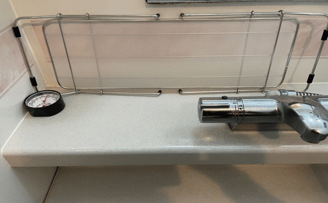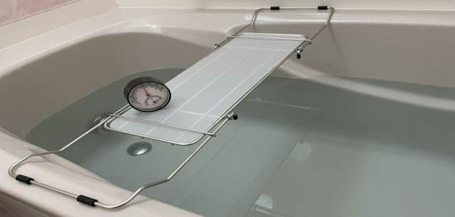 1.まずバスタブトレーを浴槽に置き、温湿度計をその上に設置します。