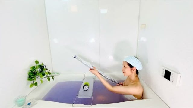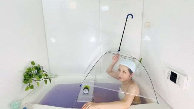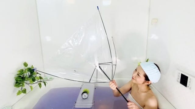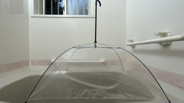 4.内側の中棒を持ちながら、入浴し体を覆うよう浴槽のフレーム上に設置して下さい。しっかり設置できれば出来上がり!
