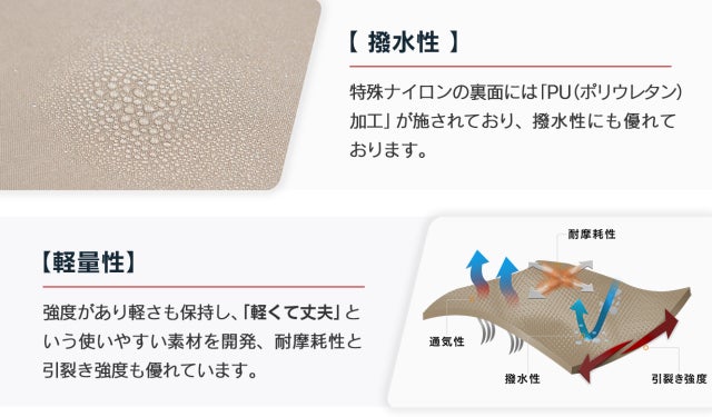 コット生地は、適度な弾力ある特殊ナイロン500Dを採用。心地いい寝心地をご提供致します。