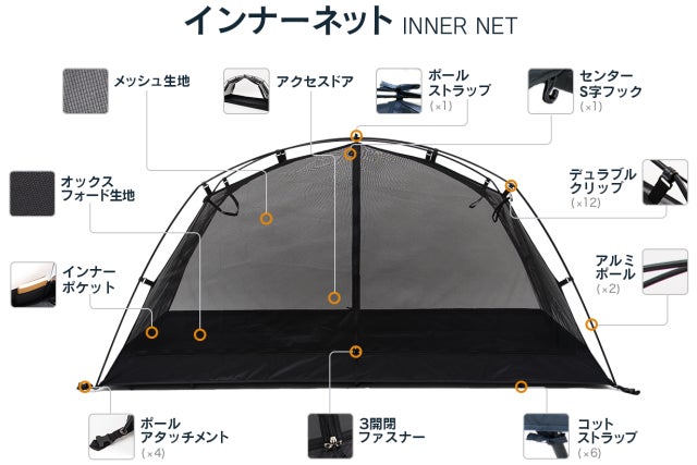 また、テントのコットへの接続方法の詳細や写真などが有ればわかりやすいのですが。