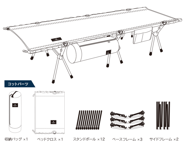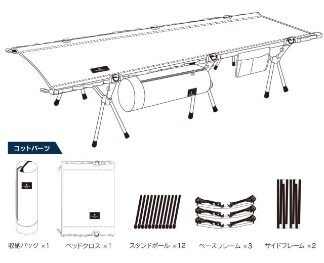 テントとコットで使われているのはアルミニウム合金、その中でも高い強度を誇る「A7075」という「超々ジュラルミン」。コットの耐荷重は、安心の『150㎏』。