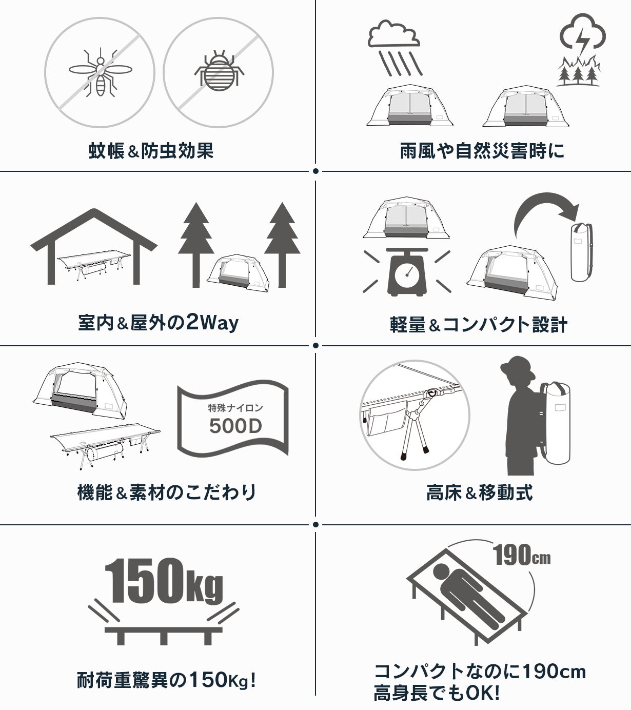 テント、コット共に単独利用は勿論のこと、テントコットの一体型で移動可能、屋内、屋外と、利用用途は幅広くご利用できます。