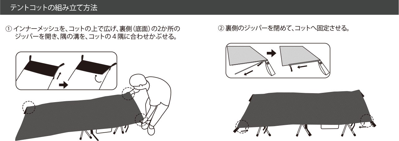 コットとインナーネットの装着方法は、下記のようにインナーネット裏のジッパーを開き、コットの4隅に被せ、ジッパーを閉じて頂き設置完了です。
