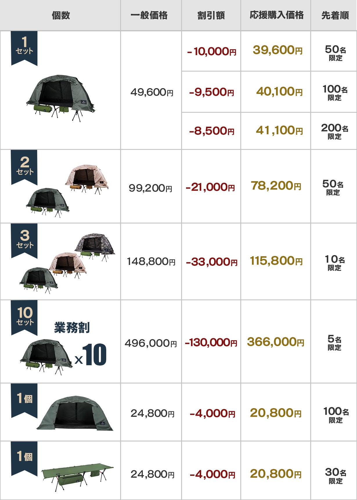 テント単体でもご支援頂けますので、ご検討のほどお願い致します。