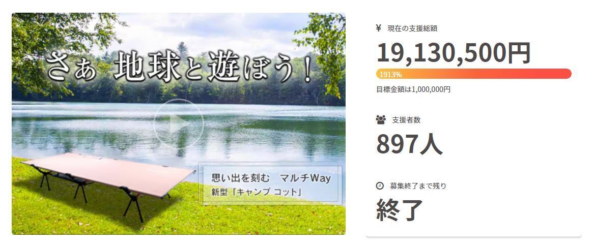 2021年3月、誕生と共にクラウドファンディング総支援2,000万円超えしたキャンプコット「 Naturaldrop 」