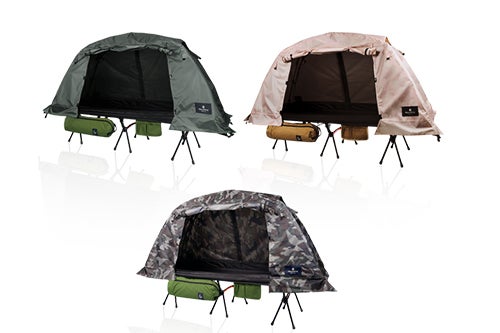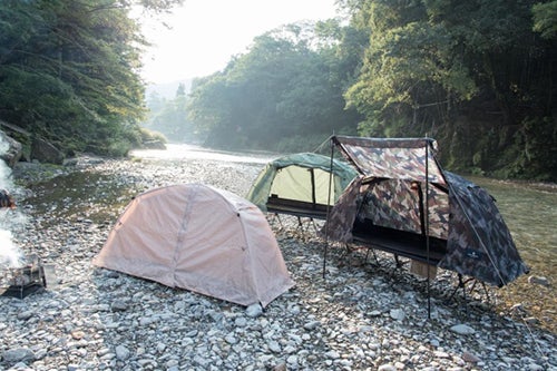 新登場となる、コットの上に乗るテント「高床移動式タイニーテントコット」は、従来のコットと組み合わせて利用も可能。